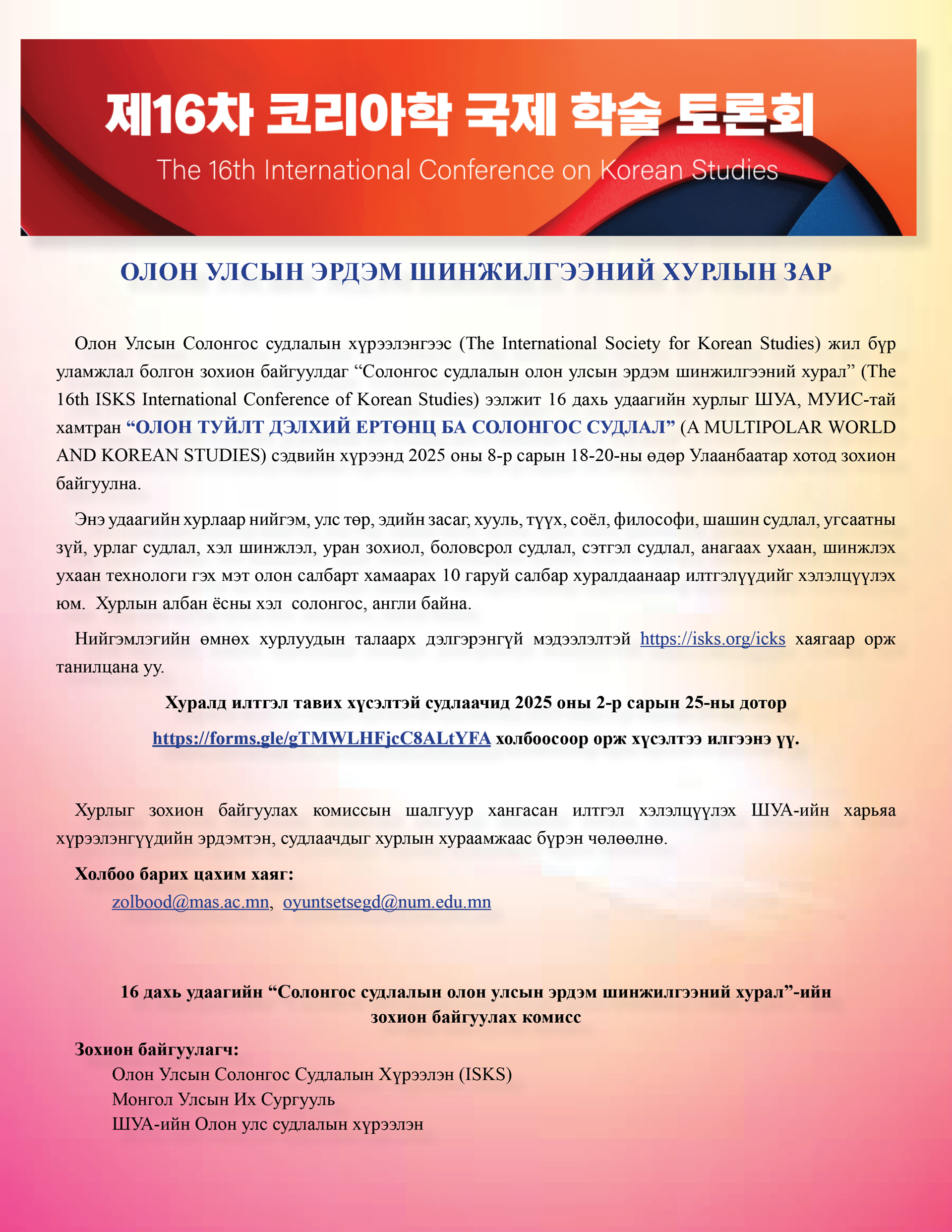 Олон Улсын Солонгос судлалын хүрээлэнгээс (The International Society for Korean Studies) жил бүр уламжлал болгон зохион байгуулдаг “Солонгос судлалын олон улсын эрдэм шинжилгээний хурал” (The 16th ISKS International Conference of Korean Studies) ээлжит 16 дахь удаагийн хурлыг ШУА, МУИС-тай хамтран “ОЛОН ТУЙЛТ ДЭЛХИЙ ЕРТӨНЦ БА СОЛОНГОС СУДЛАЛ” (A MULTIPOLAR WORLD AND KOREAN STUDIES) сэдвийн хүрээнд 2025 оны 8-р сарын 18-20-ны өдөр Улаанбаатар хотод зохион байгуулна.