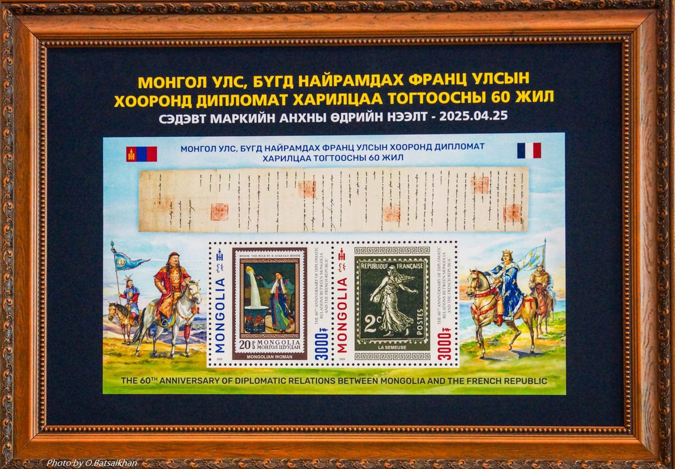 Мөн өдөр хоёр улсын дипломат харилцааны түүхийг өгүүлэх гэрэл зургийн үзэсгэлэн болон тэмдэглэлт ойд зориулсан шуудангийн шинэ маркийн нээлтийн ёслол Гадаад харилцааны яаманд боллоо. Түүнчлэн Монголын Дипломатын академи, Монгол-Францын найрамдлын нийгэмлэгээс хамтран гаргасан “Өнгөрсөн, одоо, ирээдүйн зааг дахь нэгэн жаран” хэмээх шинэ бүтээлийн нээлт “Номин” танхимд болж өнгөрлөө. Тус бүтээлийг Монголын Дипломатын академийн захирал, Монгол-Францын найрамдлын нийгэмлэгийн тэргүүн, Онц бөгөөд бүрэн эрхт элчин сайд, доктор (Ph.D) Х.Бэхбат эрхэлж, хянан тохиолдуулсан ба бүтээлд хоёр орны хамтын ажиллагааны эрт, эдүгээгийн түүхийг авч үзэн, Монгол Улсад Франц Улс, франц хэлтний соёлыг түгээн дэлгэрүүлэх хийгээд хоёр орны харилцааг хөгжүүлэхэд үнэтэй хувь нэмрээ оруулсан үе, үеийн багш, ахмад дипломатчидын дурсамж, хоёр талын харилцаанд холбогдох баримт бичгүүд болон түүхэн гэрэл зургуудын хамт багтаасан байна.