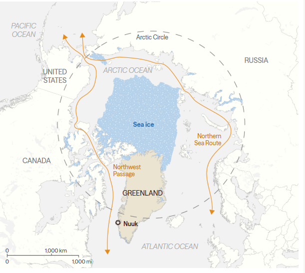 Хоёрдугаарт: Дэлхийн уур амьсгалын өөрчлөлтөөс үүдэн Арктик, Гренланд аралд тэнгисийн худалдааны шинэ гарцууд үүсэх боломжтой болж, газрын ховор элемент, байгалийн баялаг олборлох боломж нэмэгдсэн зэргийг нэрлэж болох юм.